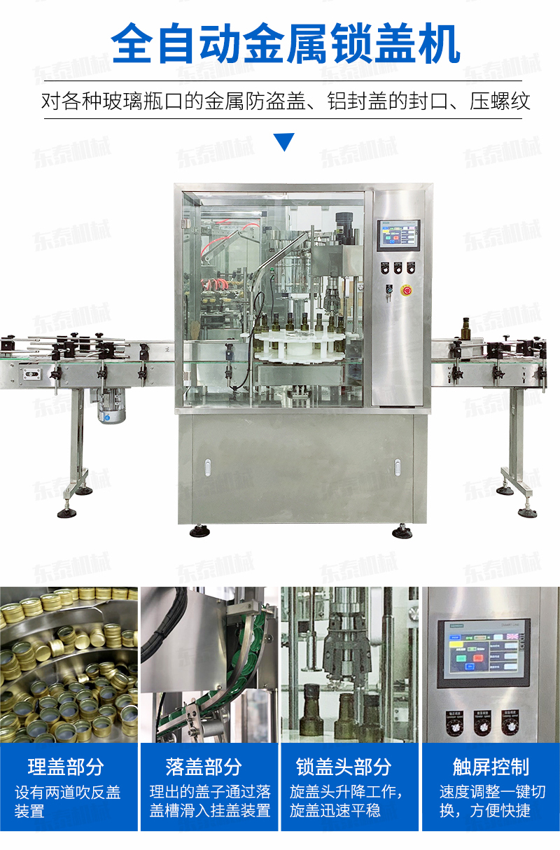 本設(shè)備適用于食品、化妝品、化工等行業(yè),主要針對(duì)各種玻璃瓶口的金屬防盜蓋鋁封蓋的封口、壓螺紋等。該設(shè)備可單機(jī)使用,也可以與灌裝機(jī)等設(shè)備組成生產(chǎn)流水線自動(dòng)作業(yè);