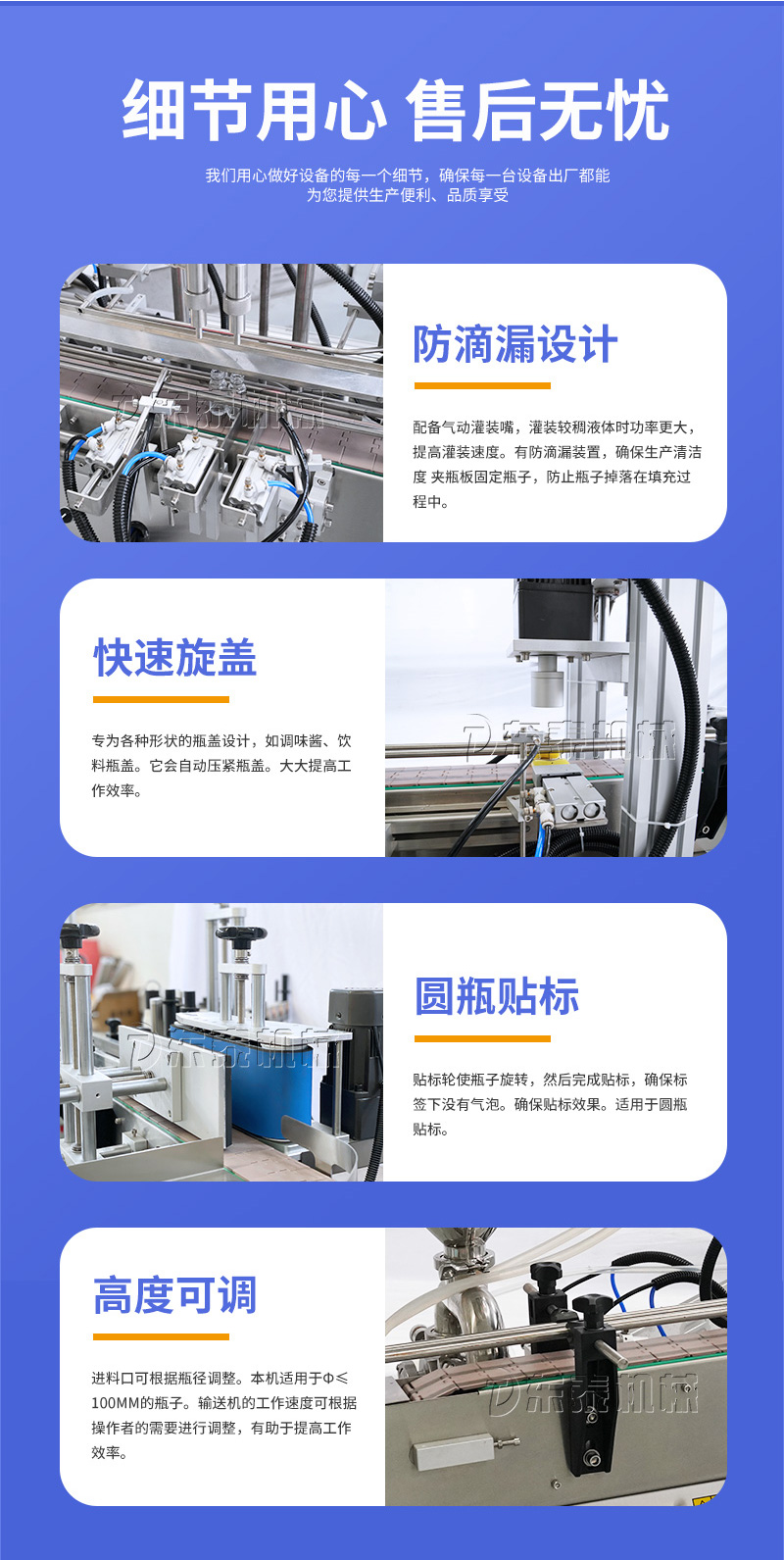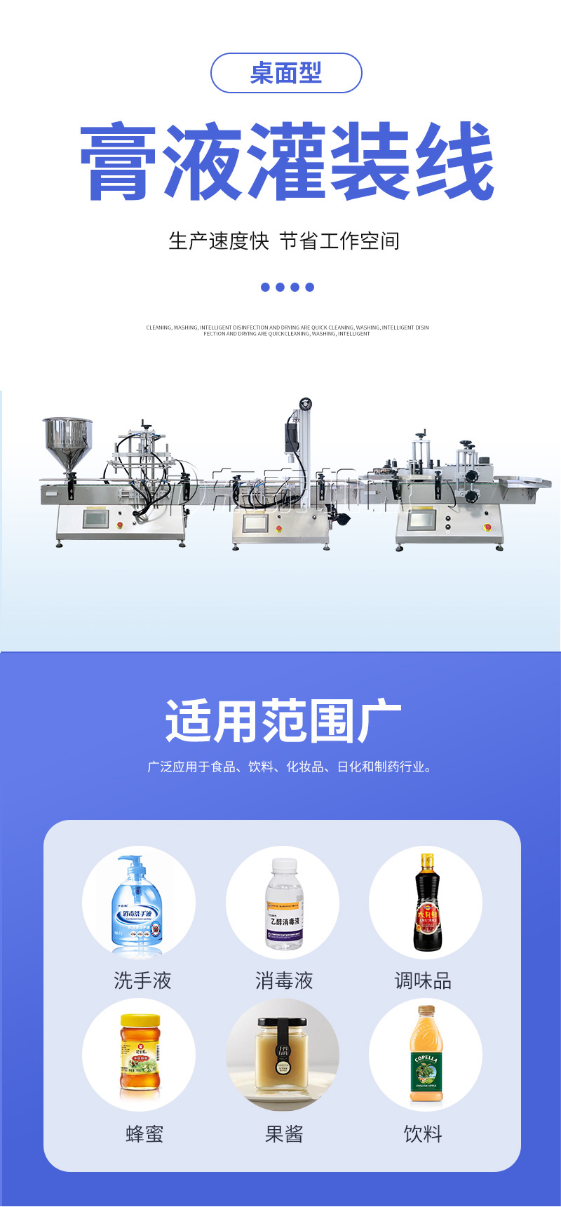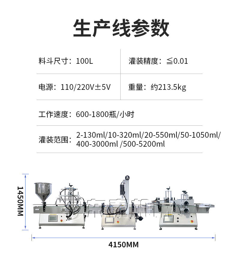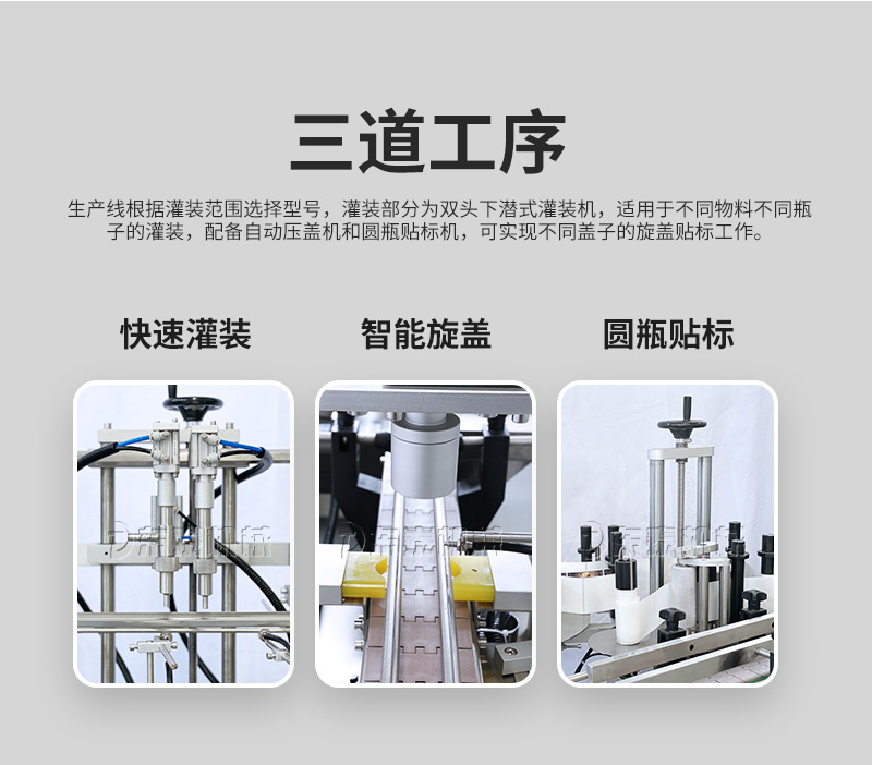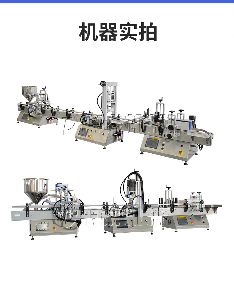 產(chǎn)品說明:生產(chǎn)線根據(jù)灌裝范圍選擇型號,灌裝部分為雙頭下潛式灌裝機,適用于不同物料不同瓶子的灌裝,配備自動壓蓋機和圓瓶貼標(biāo)機,可實現(xiàn)不同蓋子的旋蓋貼標(biāo)工作。 本設(shè)備主要適用于食品、日常化工