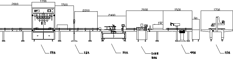 | 方案設(shè)計一:灌裝機+壓蓋機+貼標機+自動膠帽熱縮機+噴碼機+封箱機 |